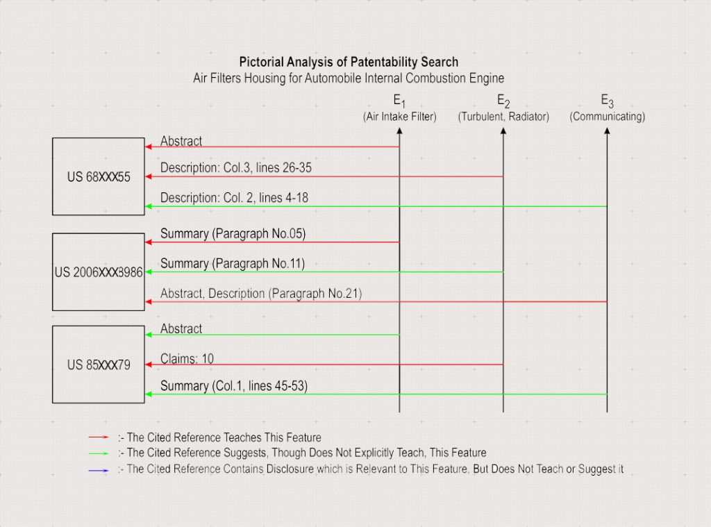 E2: The air intake filter comprising, housing sized for mounting beneath the hood and having means for in taking air in front of the radiator, the air entering the housing before becoming turbulent due to flow around the radiator.